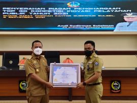 BANTAENG,BERANDA.NEWS – Bupati Bantaeng, DR Ilham Azikin didampingi sejumlah Kepala OPD menghadiri Penyerahan Piagam Penghargaan Top 30 Kompetisi Inovasi Pelayanan Publik Tahun 2021. Apresiasi untuk Kabupaten dan Kota Inovatif itu digelar di Ruang Rapat Pimpinan Kantor Gubernur Sulsel, Makassar 6 September 2021.