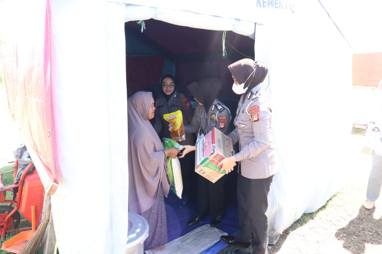 Terlihat, Senyum bahagia tak dapat ditutupi dari wajah korban kebakaran saat melihat rombongan polwan mendatangi tempat pengungsian sementara yang didiran dilapangan bola Kelurahan Ela Ela,
