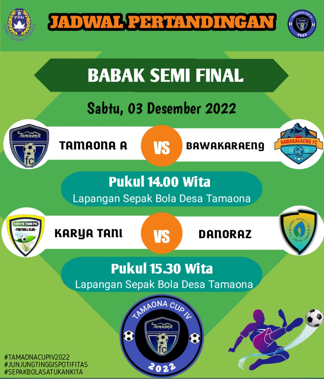 Ke empat Tim tersebut diantaranya, Tamaona A VS Bawakaraeng dan Karya Tani (Batuara) VS Danoraz ( Rilau Ale). Kick Off akan di mulai Pukul 14-00 WITA