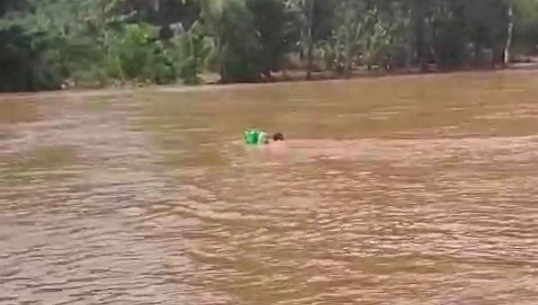 Dengan penuh keberanian, dia membawakan makanan untuk dua orang yang terjebak di atas pohon kelapa, menggunakan pohon pisang sebagai alat untuk menyeberangi banjir