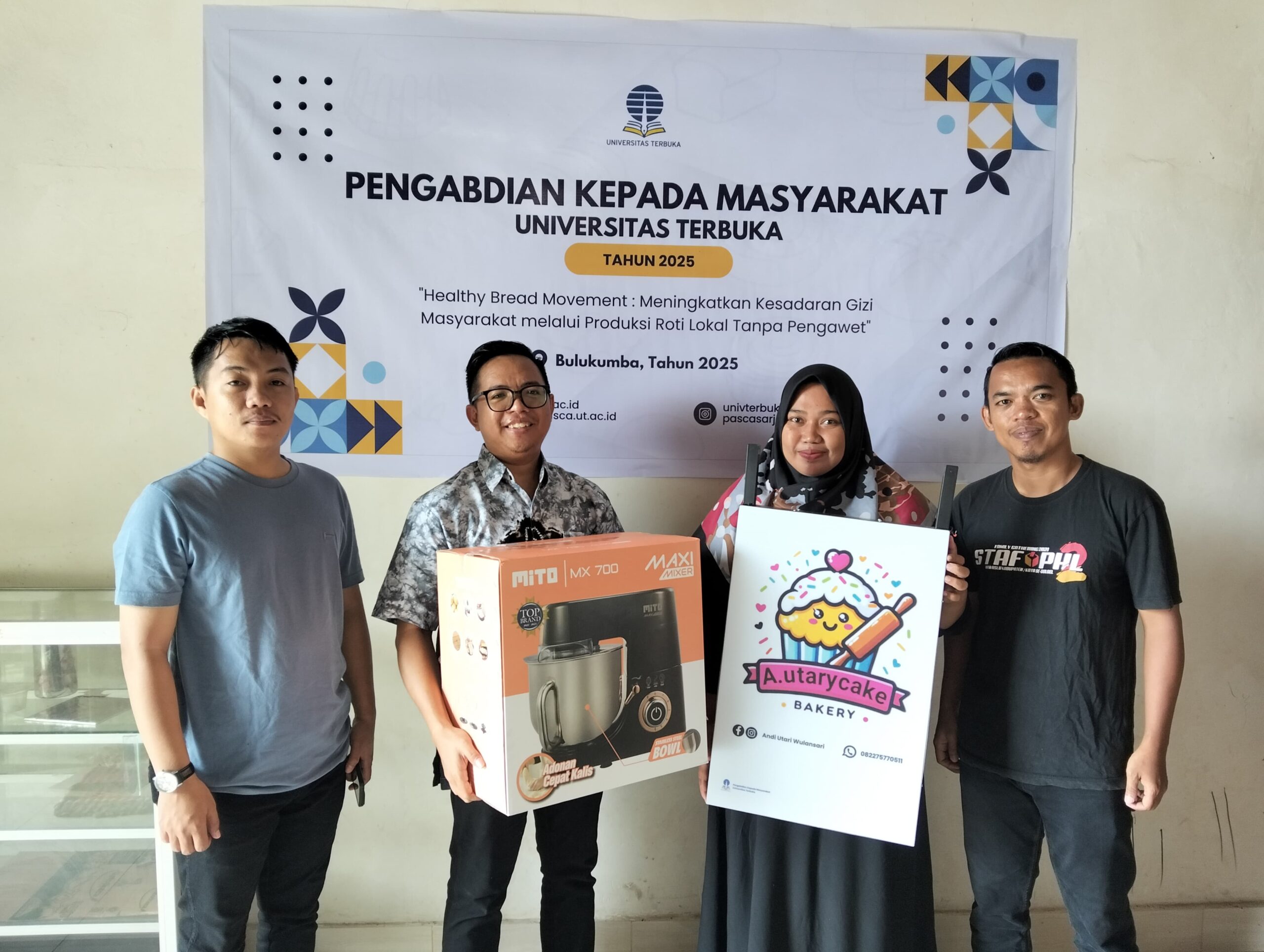 Bulukumba.Beranda.News – Universitas Terbuka (UT) terus berkomitmen mendukung usaha mikro, kecil, dan menengah (UMKM) melalui program Pengabdian kepada Masyarakat (PKM). Kali ini, UT menyasar Kecamatan Bonto Bahari, Kabupaten Bulukumba, Sulawesi Selatan, dengan menggandeng A. Utary Cake Bakery, usaha roti lokal milik Andi Utari Wulansari dan suaminya, Zaenal Hasmar, yang dibantu oleh enam karyawan.
