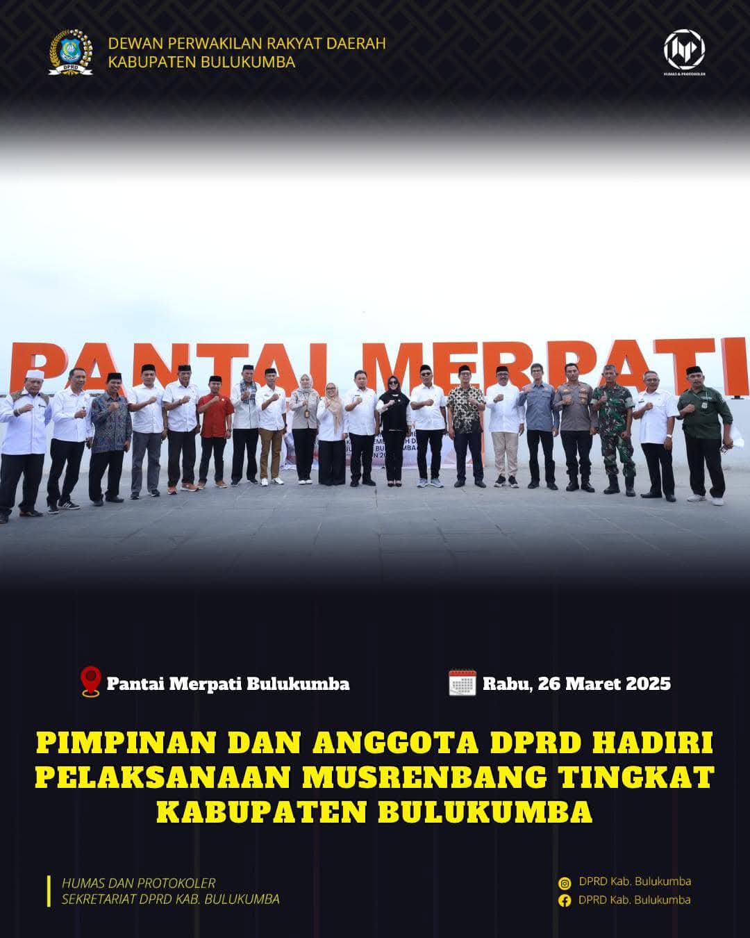 Bulukumba, Beranda.News-Pimpinan dan Anggota DPRD Kabupaten Bulukumba turut hadir dalam pelaksanaan Musyawarah Perencanaan Pembangunan (Musrenbang) tingkat Kabupaten yang digelar di Pantai Merpati, Bulukumba, Rabu (26/3/2025).