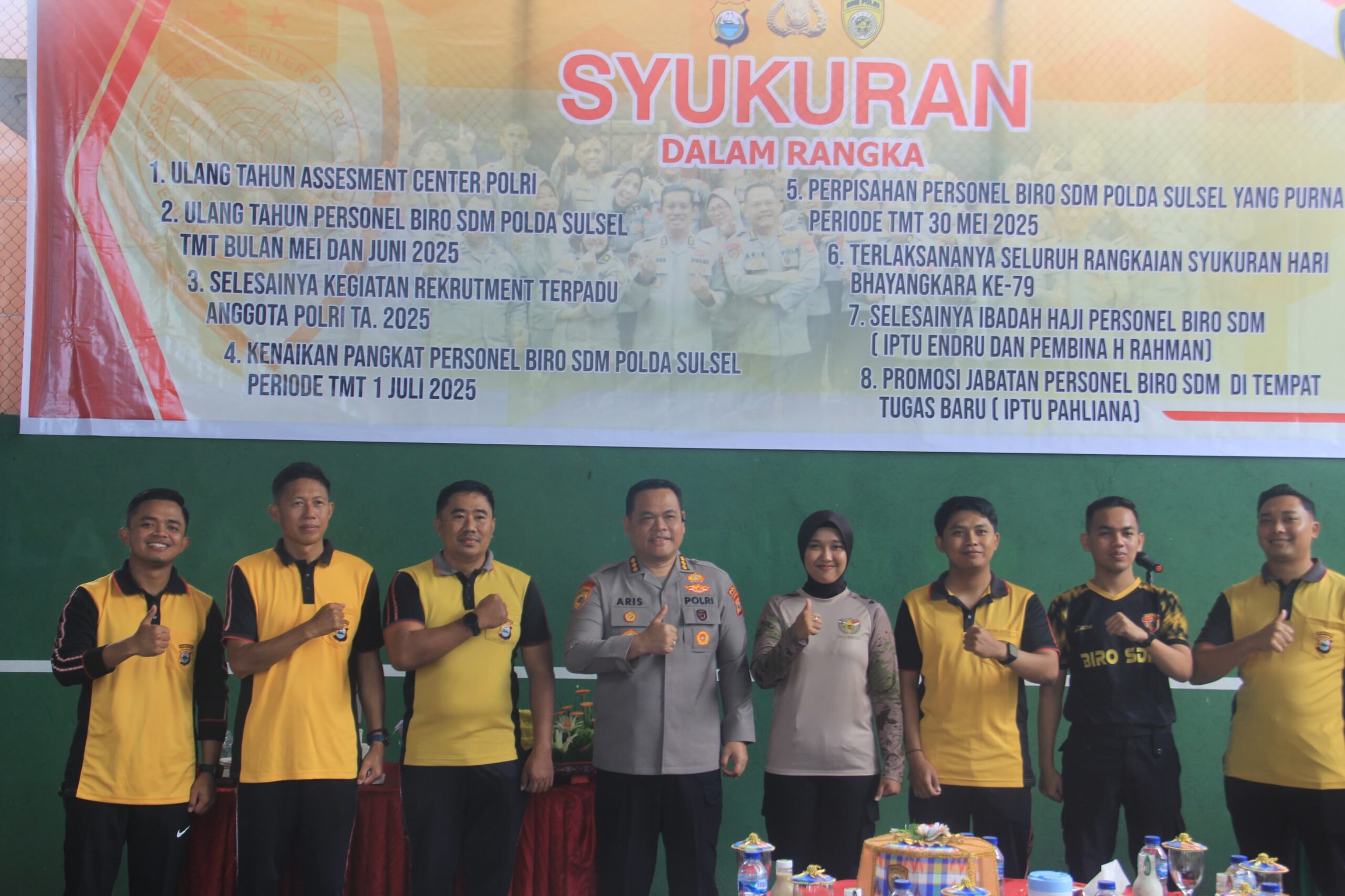 Acara diawali dengan doa bersama dan dilanjutkan dengan pemotongan tumpeng sebagai bentuk rasa syukur atas sejumlah capaian Biro SDM Polda Sulsel. Di antaranya, selesainya proses rekrutmen terpadu anggota Polri tahun anggaran 2025, kenaikan pangkat personel periode 1 Juli 2025, pelepasan personel yang memasuki masa purna bakti, perayaan ulang tahun personel untuk periode Mei–Juni, serta syukuran atas pelaksanaan ibadah haji dan mutasi personel keluar.