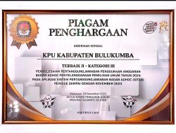 Bulukumba, Beranda News- Komisi Pemilihan Umum (KPU) Kabupaten Bulukumba meraih penghargaan kedua untuk laporan pertanggungjawaban pada Sistem Informasi Tata Kelola ...